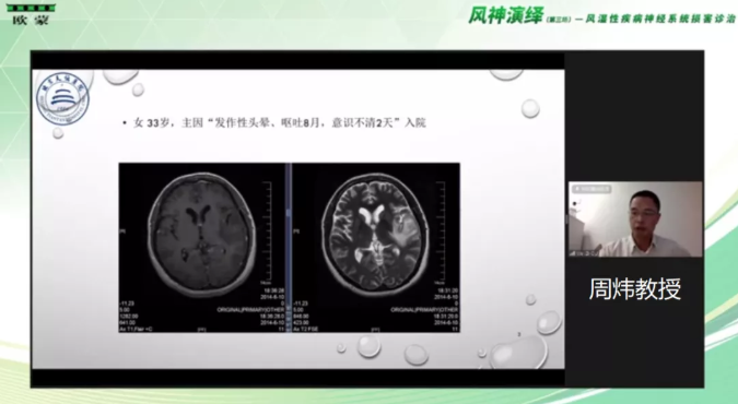 周煒教授首先圍繞“系統性紅斑狼瘡累及的神經系統損害”這一主題為在線同仁帶來了精彩的學術報告分享。周教授通過幾個神經精神性狼瘡(NPSLE)真實病例對SLE神經系統受累進行了詳細的解讀。他認為,SLE神經系統受累發生機制復雜,臨床表現形式多樣,早期診治存在一定困難性。近些年有研究表明,SLE或許與某些自身抗體相關,但是由于目前NPSLE的診斷還缺乏特異性的生物標志物,因此仍然要結合臨床表現等進行診斷。另外,對于SLE引發的神經系統受累還存在哪些對疾病診療有提示作用的臨床表現,還需要更多有力的研究數據進行支持。