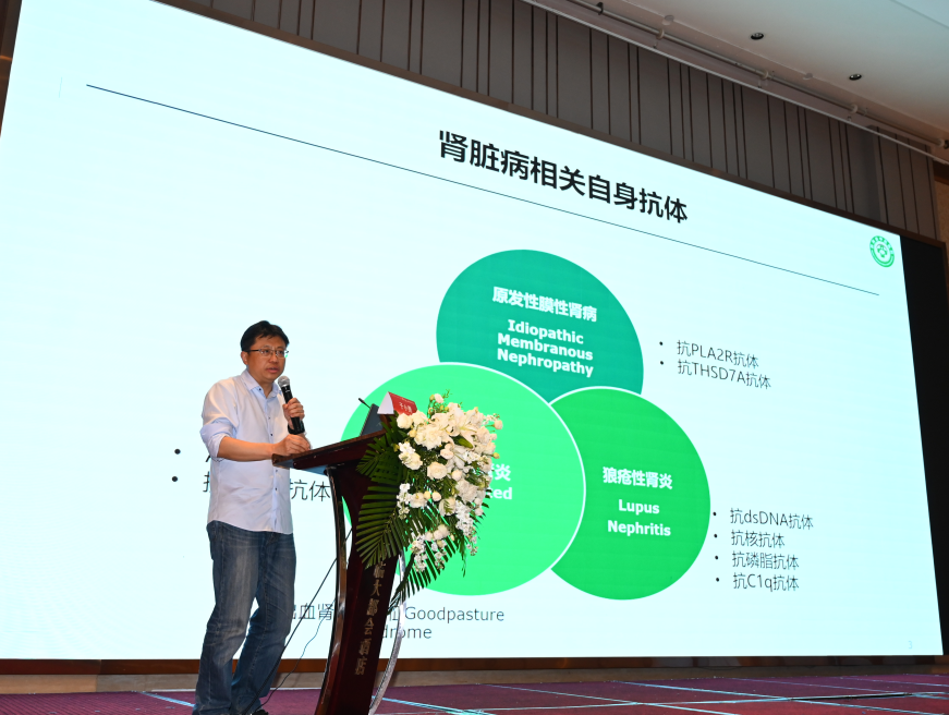 于教授主要從原發性膜性腎?。╬MN)、狼瘡腎炎相關檢測指標和血管炎相關免疫指標三個方面展開了分享,尤其對MN部分進行了大篇幅的介紹。他指出MN可分為原發性膜性腎?。╬MN)和繼發性膜性腎?。╯MN ),其中pMN在MN中約占80%。腎小球足細胞上的抗磷脂酶A2受體(PLA2R)是pMN的主要靶抗原,目前已成為國內外專家、學者公認的pMN標志性抗體。同時,2021年最新版《KDIGO腎小球疾病診治指南》強調具有腎病綜合征臨床表現和血清抗PLA2R抗體檢測陽性的患者,不需要腎活檢即可確診為膜性腎病。目前檢測抗 PLA2R 抗體的方法主要有間接免疫熒光法(IIF)和酶聯免疫吸附法(ELISA)。IIF和ELISA雙方法學聯檢,可有效避免漏診。最后,于教授強調,抗PLA2R不僅是pMN臨床診斷的特異性指標,對于鑒別診斷pMN和sMN、疾病活動度評估均具有重要意義,而且還可指導臨床制定治療方案及對治療效果進行監測。