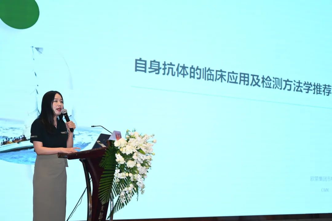 朱女士進行了題為“自身抗體的臨床應用及檢測方法學推薦”的學術報告,作為本次會議的承辦單位,她首先代表歐蒙公司對各位遠道而來的老師表示了感謝。她指出,自身抗體在自身免疫性疾病診療過程中的很多環節都具有重要的應用價值,如預測、診斷、鑒別診斷、治療監測和預后評估等。截至目前用于自身抗體檢測的方法學非常豐富,除了經典的IIF、ELISA、放射免疫法及免疫印跡法之外,還有被逐步應用于自身免疫性疾病領域的化學發光法。作為ANA檢測的金標準,IIF通常被用作進行總抗體的篩查,它憑借著自己的諸多優勢,在自身抗體檢測方面始終無可替代。免疫印跡法,在特異性抗體確認方面,一直以來應用率都是最高的,占了80%左右,且經過了長年的臨床驗證,其檢測性能也是非常穩定的?;瘜W發光法,在自身抗體檢測領域應用率越來越高,近兩年NCCL室間質評數據顯示,在ANA特異性抗體確認方面有10%以上的實驗室都已開展了化學發光法。